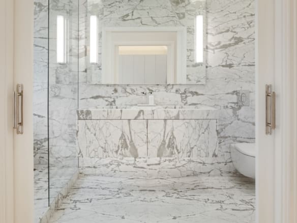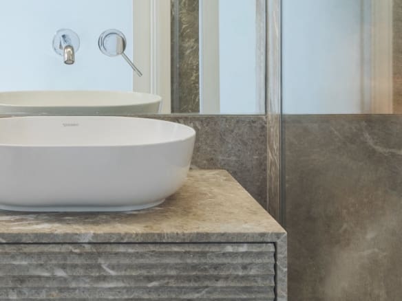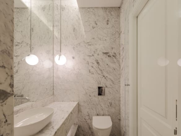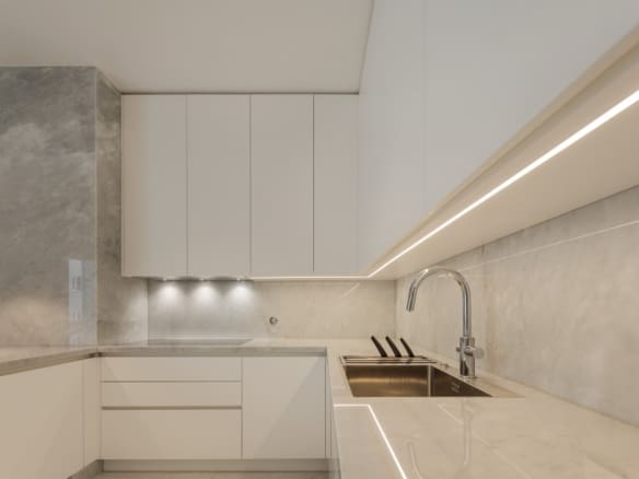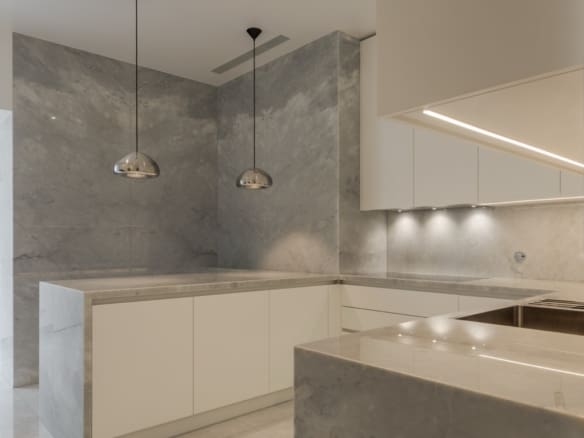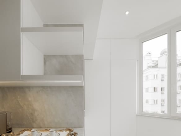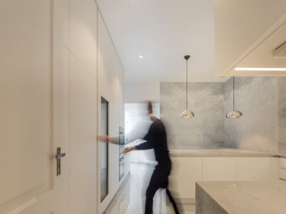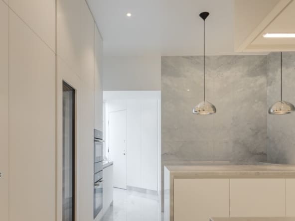The kitchen, in a peninsula style, is a standout feature, with marble countertops and white lacquered cabinetry with Blum drawer systems. MIELE appliances ensure both practicality and efficiency, including a double refrigerator separated from the freezer, which also includes an ice machine, as well as a dual-temperature wine fridge with a capacity for 80 bottles. For daily comfort, the kitchen is equipped with faucets offering filtered, chilled water with gas. The apartment also features a separate laundry room, complete with suspended wardrobes and a sink, providing both functionality and organisation.