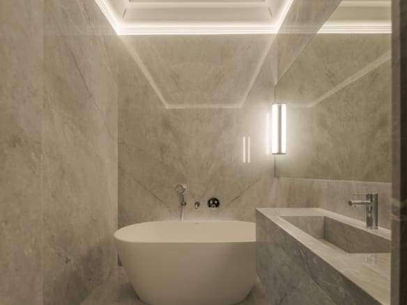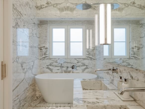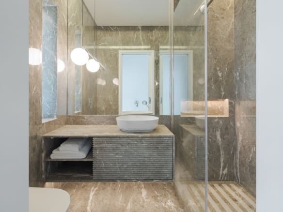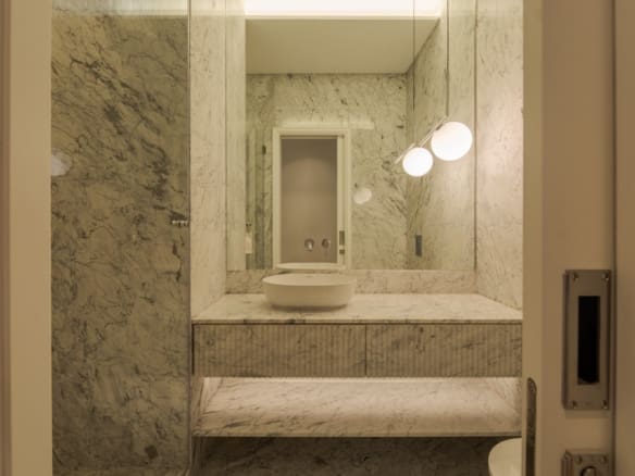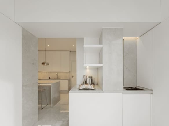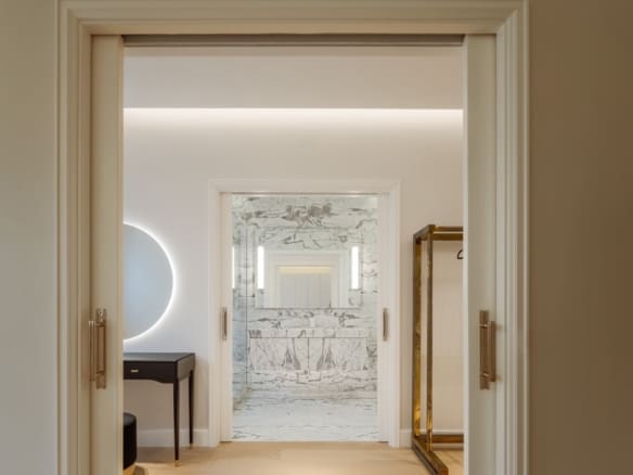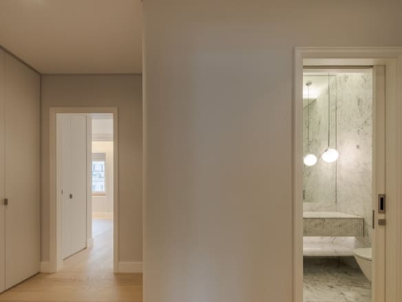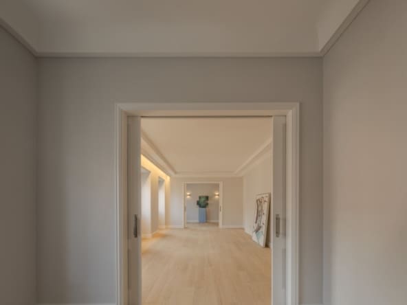 With an East-West orientation, the apartment enjoys natural light throughout the day. The main living room, measuring 61 sqm, offers two interconnected spaces that can either be integrated into a large living area or separated by hidden doors for greater privacy.